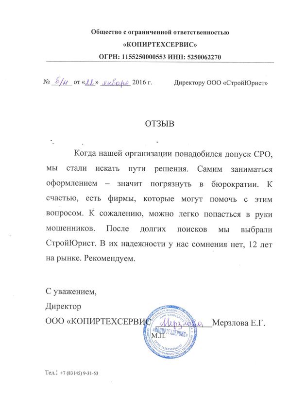 Отзывы клиентов "СтройЮрист" по вступлению в СРО в Нижнем Тагиле
